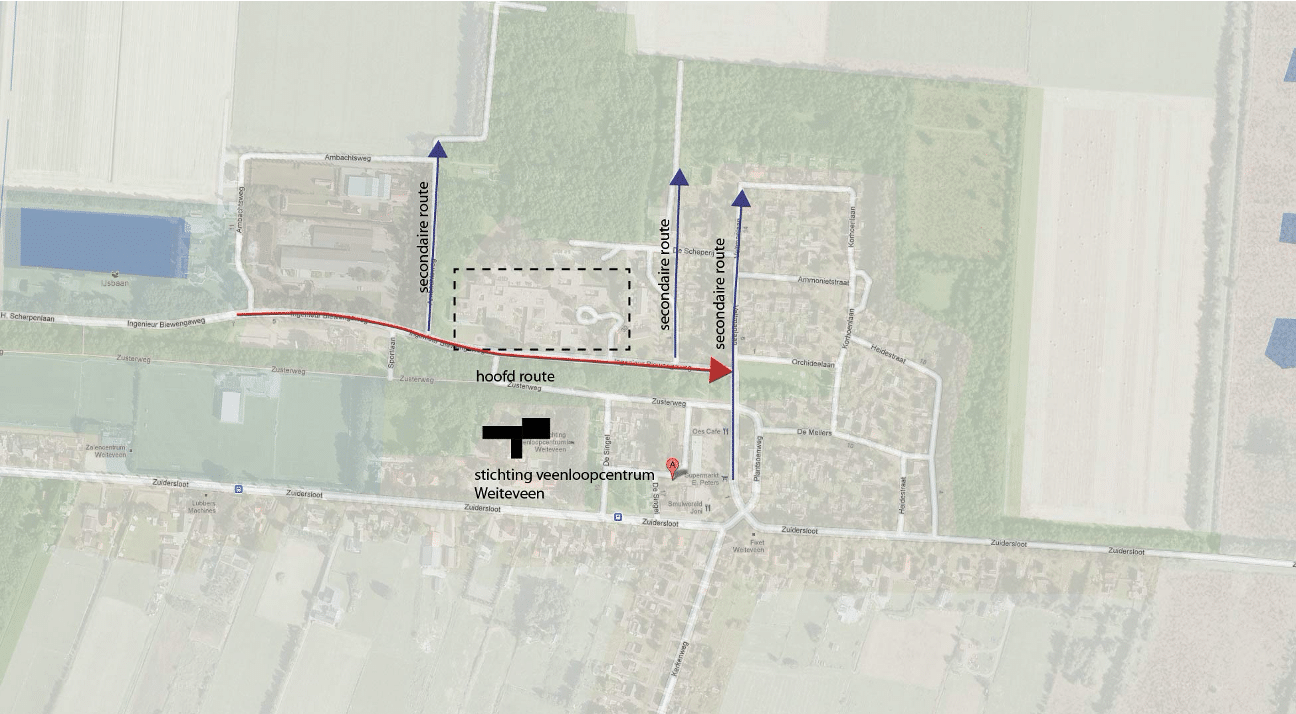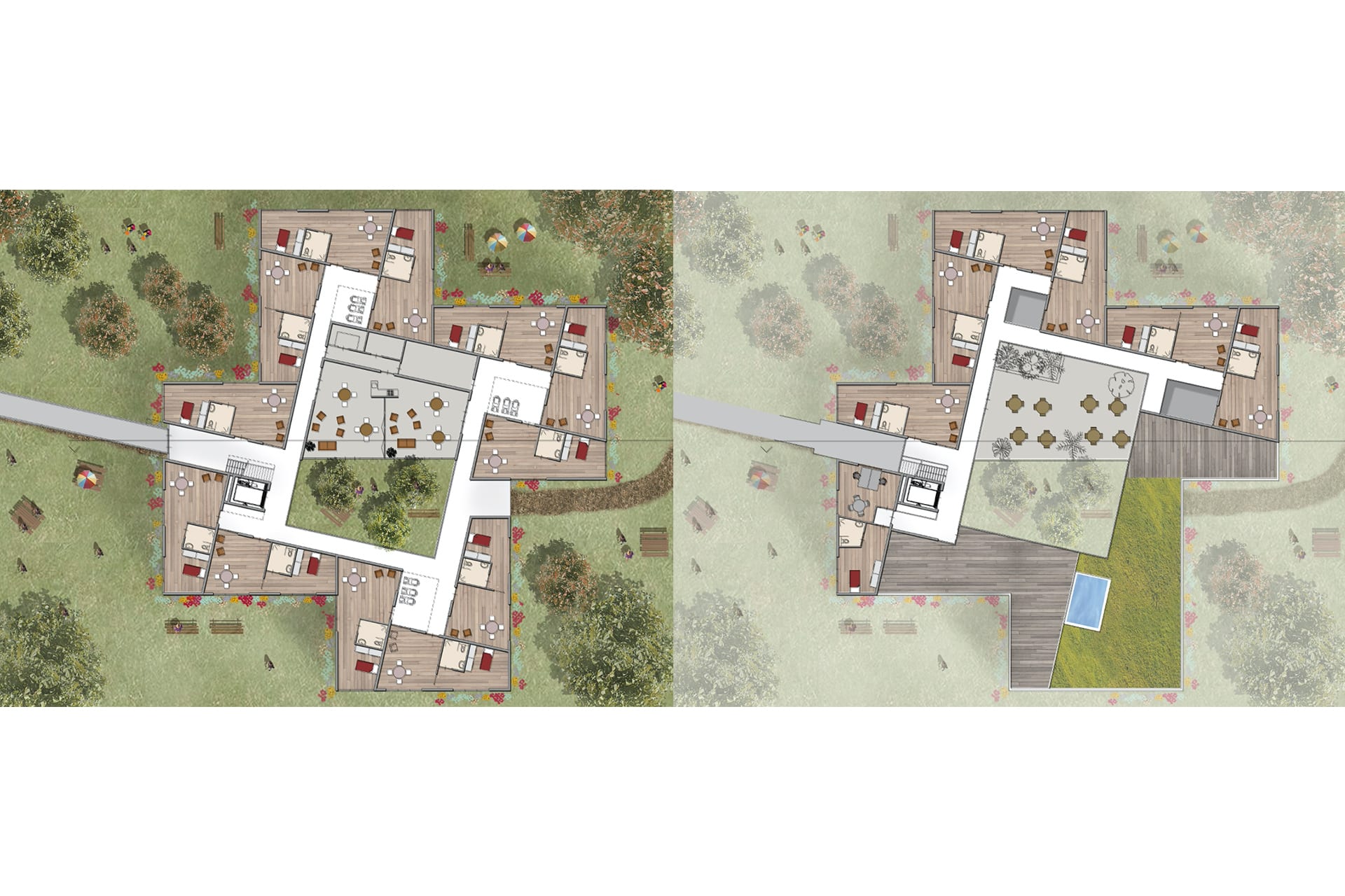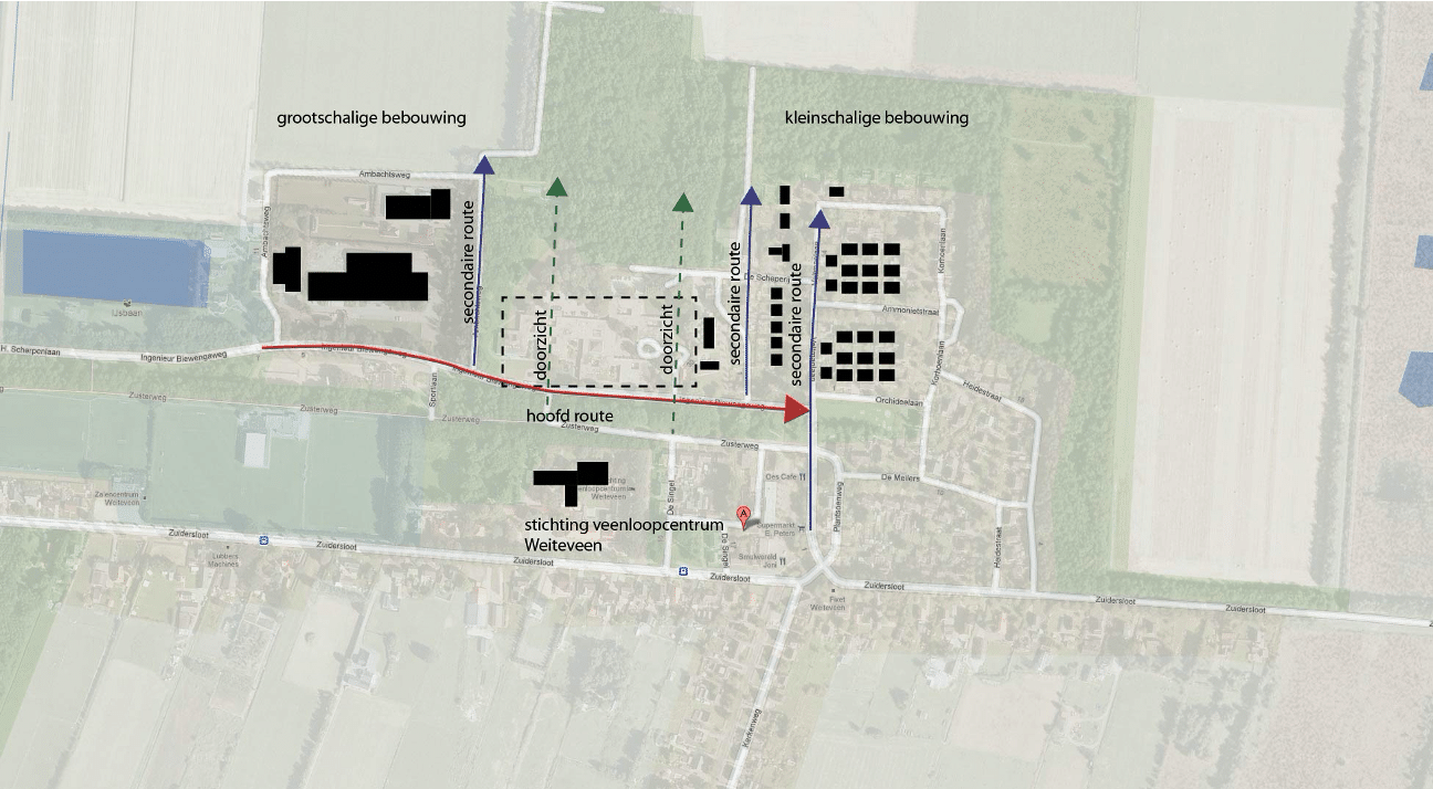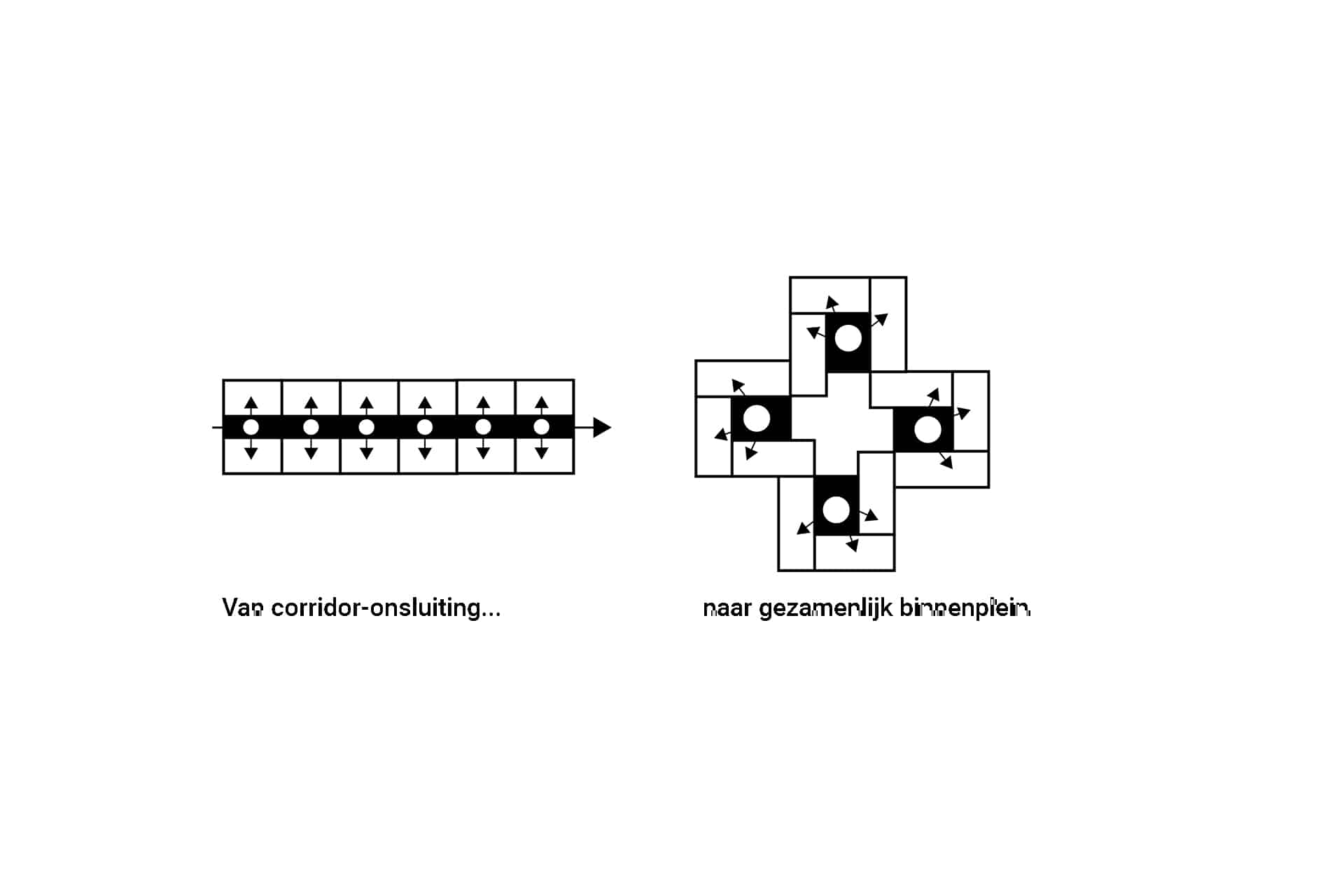 Een standaard corridor-ontsluiting heeft als risico dat een strenge en anonieme verkeersruimte ontstaat, zonder ruimtelijke kwaliteiten. In een verzorgingshuis zijn bewoners veelal gebonden aan hun directe woonomgeving. We hebben daarom in onze visie juist het bewegen tussen de paviljoens en het ontmoeten in de gevarieerde verblijfruimten als uitgangspunt genomen voor het ontwerp. Dit heeft geresulteerd in een logisch grid van verkeersaders, die alle paviljoens als eigen identiteit wegzetten en tegelijkertijd de bewoners de gelegenheid geven om langs panoramaroutes de centrale voorzieningen te bereiken.