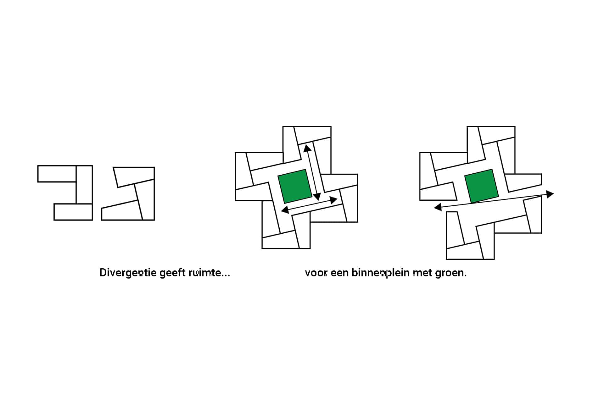 Het programma bestaat uit 72 wooneenheden van 50 m2. Het bouwsysteem is in samenwerking met de aannemer zodanig uitontwikkeld, dat ondanks de convergerende wanden, een eenvoudig bouwsysteem toe te passen is, waardoor het voordeel drieledig is: