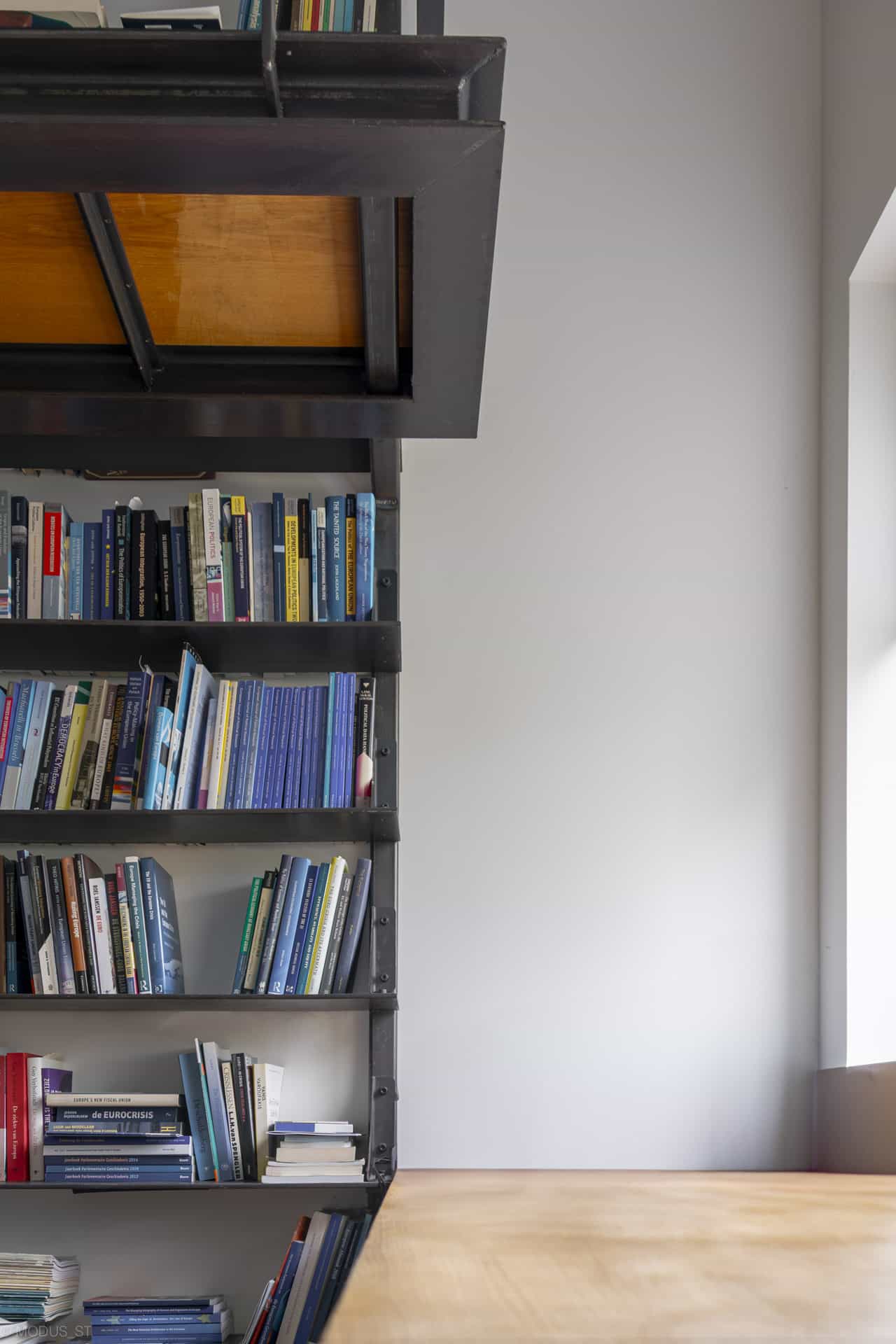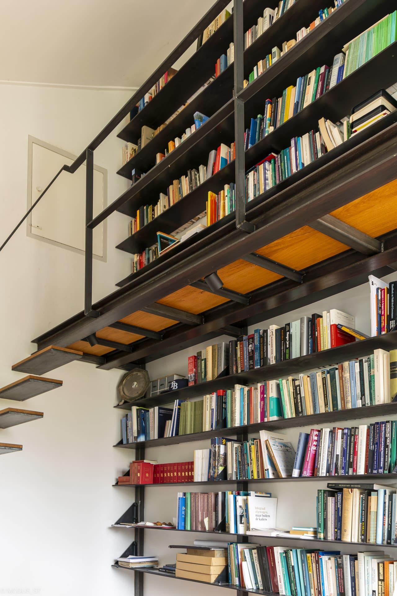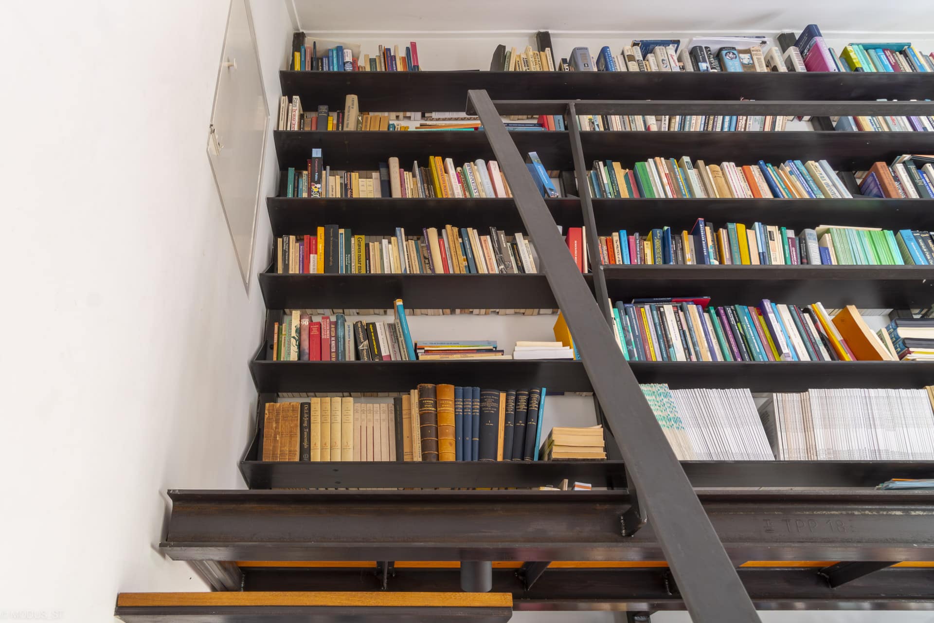 Voor een particulier opdrachtgever is een bibliotheek ontworpen van staal. De woning is van de hand van architectenbureau Leo de Jonge en betreft een atypisch jaren ’70 woning met een fraai ensemble van schuine dakvlakken. De ruimtelijkheid die daarmee wordt gecreëerd heeft de mogelijkheid gegeven om in een kleine kamer een ruimte bibliotheek met werkplek te ontwerpen. De boekenplanken bestaan uit verstevigde stalen platen, deels bereikbaar met een bordes. De traptreden zijn gemaakt van stalen strips, waarbij de achterconstructie volledig weggewerktis in de scheidingswand. Het bureau is onderdeel van het maatwerkmeubel en bestaat uit staal en massief eikenhout.