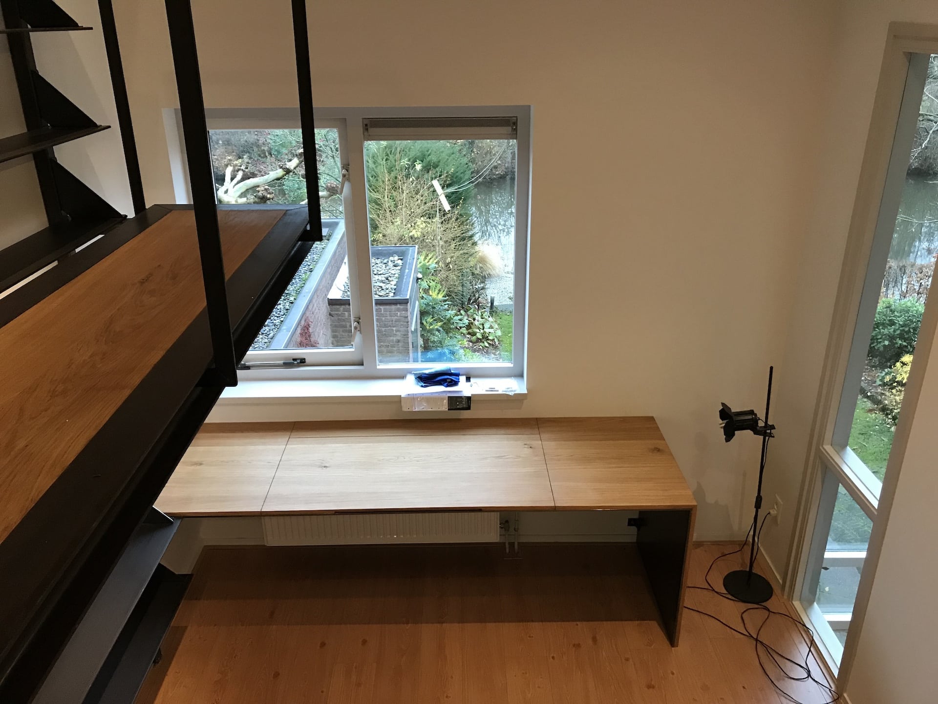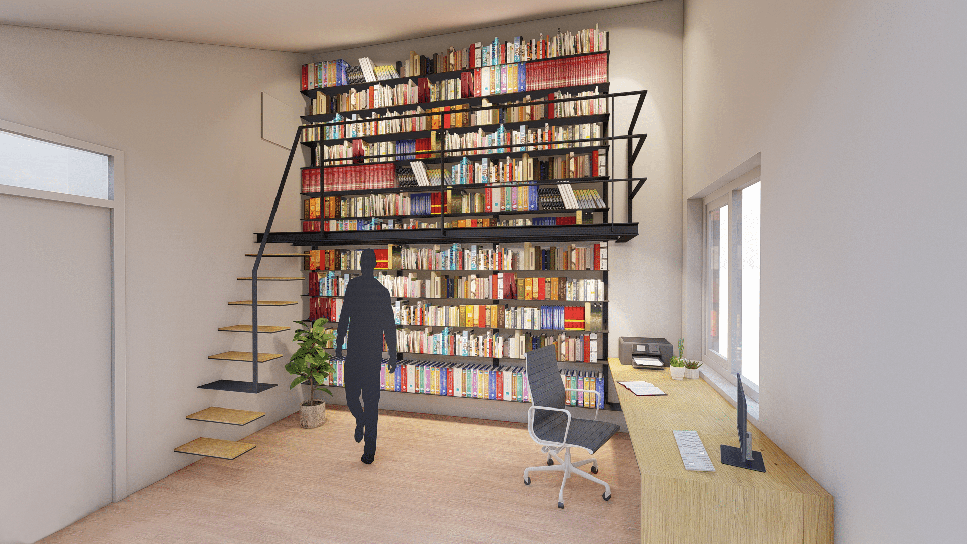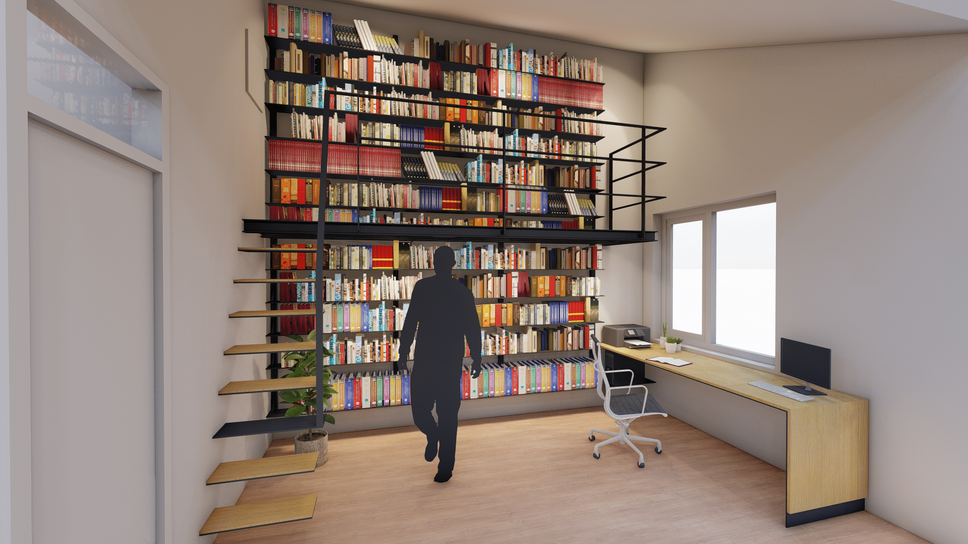Voor een particulier opdrachtgever is een bibliotheek ontworpen van staal. De woning is van de hand van architectenbureau Leo de Jonge en betreft een atypisch jaren ’70 woning met een fraai ensemble van schuine dakvlakken. De ruimtelijkheid die daarmee wordt gecreëerd heeft de mogelijkheid gegeven om in een kleine kamer een ruimte bibliotheek met werkplek te ontwerpen. De boekenplanken bestaan uit verstevigde stalen platen, deels bereikbaar met een bordes. De traptreden zijn gemaakt van stalen strips, waarbij de achterconstructie volledig weggewerktis in de scheidingswand. Het bureau is onderdeel van het maatwerkmeubel en bestaat uit staal en massief eikenhout.