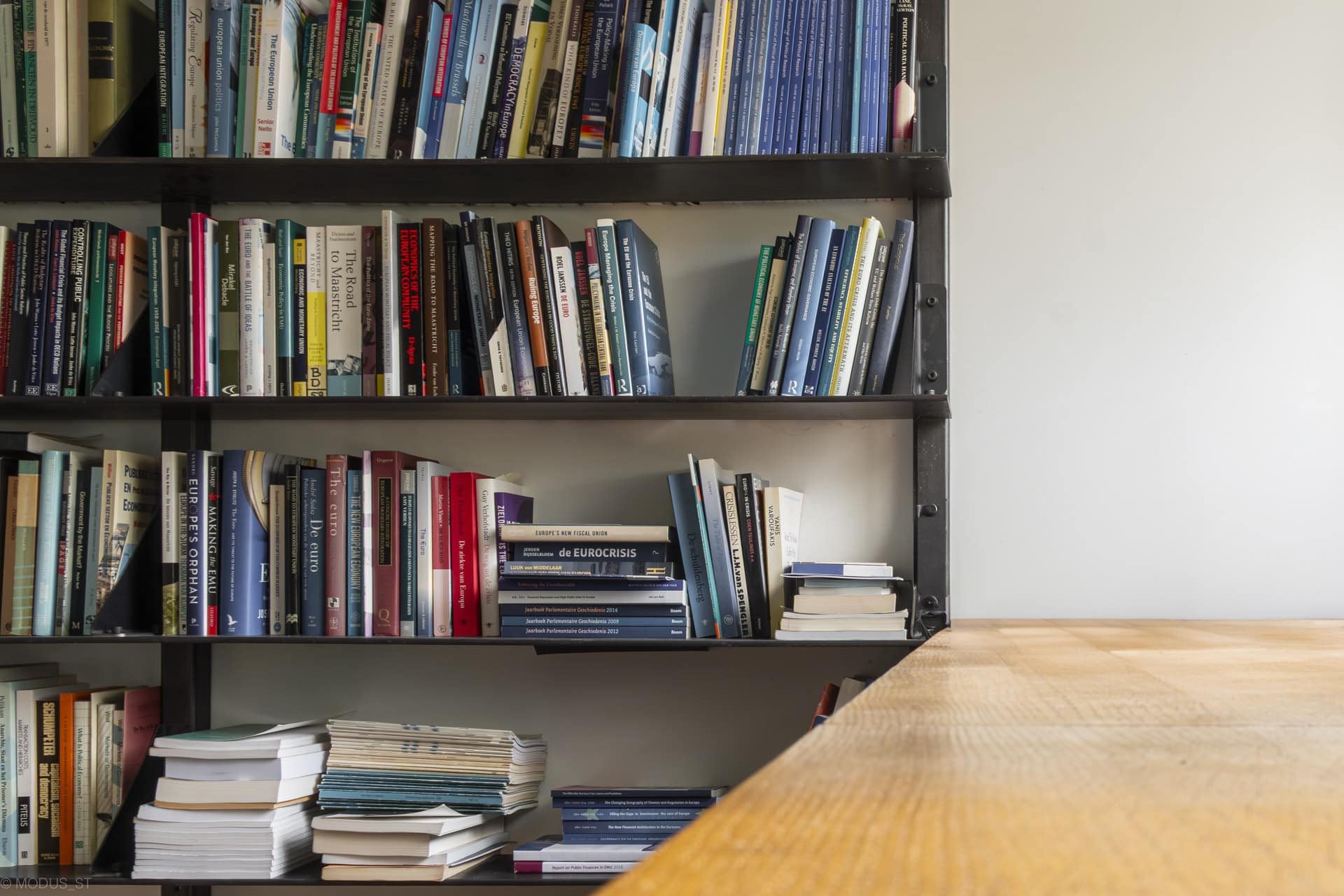 Voor een particulier opdrachtgever is een bibliotheek ontworpen van staal. De woning is van de hand van architectenbureau Leo de Jonge en betreft een atypisch jaren ’70 woning met een fraai ensemble van schuine dakvlakken. De ruimtelijkheid die daarmee wordt gecreëerd heeft de mogelijkheid gegeven om in een kleine kamer een ruimte bibliotheek met werkplek te ontwerpen. De boekenplanken bestaan uit verstevigde stalen platen, deels bereikbaar met een bordes. De traptreden zijn gemaakt van stalen strips, waarbij de achterconstructie volledig weggewerktis in de scheidingswand. Het bureau is onderdeel van het maatwerkmeubel en bestaat uit staal en massief eikenhout.